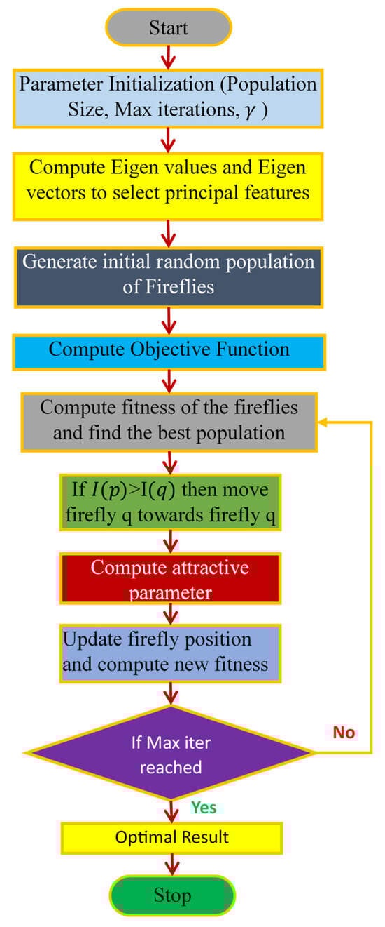 | PCA Firefly | PCA: A threshold value of 0.72 and decorrelated Eigen vector , using a trial and error training approach Firefly: Initial conditions of = 0.65, = 0.1 For both PCA and firefly, consider MSE of (10)−5 or reaching a maximum of 1000 iterations, whichever comes earliest. Criterion: MSE |