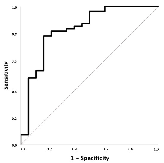 Receiver operating characteristic (ROC) curve for SMM/W ratio to exclude decreased ASMM/W index values measured by DEXA in female patients with MASLD and HTN. The area under the ROC curve (AUC) ± standard errors (SE) for SMM/W ratio was 0.834 ± 0.061; 95% confidence interval (CI): 0.715–0.954.