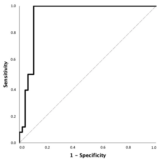 Receiver operating characteristic (ROC) curve for SMM/W ratio to confirm the presence of decreased ASMM/W index values measured by DEXA in male patients with MASLD and HTN. The area under the ROC curve (AUC) ± standard errors (SE) for SMM/W ratio was 0.929 ± 0.032; 95% CI: 0.865–0.992.
