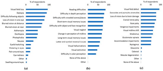 Survey results regarding knowledge of post-stroke across all countries, in response to the question “Which of the following could be experienced by an individual post-stroke (due to the stroke)”. (a) Visual symptoms, (b) visual perceptual difficulties, and (c) visual disorders.