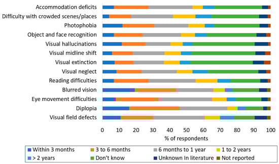 While most respondents reported that they are aware of the natural progression of visual symptoms like reading difficulties, blurred vision, eye movement problems, diplopia, and visual field defects, many (40% or less) were unfamiliar with the natural progression of symptoms and disorders such as accommodation deficits, difficulty in crowded places, photophobia, recognition of objects and faces, visual hallucinations, visual midline shift, visual extinction, and visual neglect (Figure 2).
