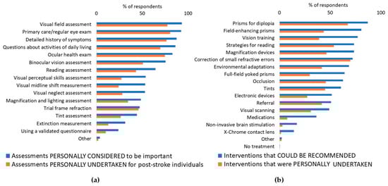 Most participants (>50%) considered several visual assessments to be important for individuals who have had a stroke (Figure 3a). These included routine eye exams (93.1%); ocular health exams (slit lamp examination and dilated fundus evaluation—83%); a detailed case history of symptoms (87.3%); specific questions about activities of daily living (86.2%); assessments of visual field (92.4%) and binocular vision beyond what would be included in primary care (75.4%); and tests involving reading (64.5%), visual perceptual skills (53.6%), visual neglect (52.9%), and visual midline shift (53.3%). This trend was consistent across all countries, as shown in Figure A6 in Appendix A. However, in all cases, few optometrists actually undertook the assessments that they thought important.