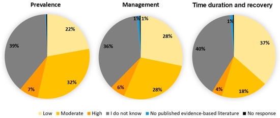 Approximately 39% of the respondents stated that they had no knowledge about the quality of published evidence related to the prevalence, management, time duration, and recovery of post-stroke visual problems (Figure 4). About 22–38% of the respondents believed that the quality of published evidence regarding the prevalence, management, time duration, and recovery of post-stroke visual consequences was either low or nonexistent (Figure 4). However, 61.6% of the participants indicated that enhancing their knowledge on this topic would be helpful in becoming more involved in post-stroke care.