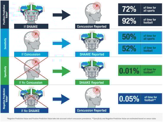 Our data demonstrate that for self-reported suspected concussion, SHAAKE has a positive predictive value of 72.4%; nearly three-quarters of the time athletes reported a SHAAKE, they said it was associated with a concussion. Using estimates of head impacts based on helmet sensor data, we were able to calculate additional parameters for football players, over 90% of the times football players reported a SHAAKE, they said it was associated with a concussion. Unsurprisingly, the majority of football collisions were not associated with concussions or SHAAKEs, resulting in a very high estimated specificity and estimated negative predictive value for the use of SHAAKE in the diagnosis of concussion for football.