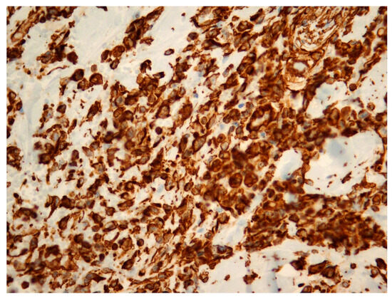 Radiation-induced breast angiosarcoma—microscopic analysis, Vimentin staining, 40 × 1.