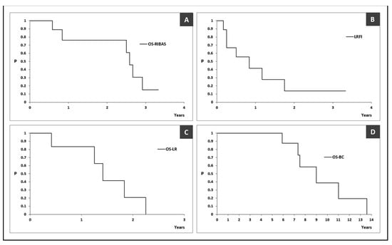 The median OS was 31 (95% CI > 30) months with an estimated 3-year survival rate of 15.2% (95% CI 2.5–91.6%) (Figure 4A). The estimated median LRFI was 10 (95% CI > 3) months (Figure 4B). The estimated median OS-LR and OS-BC were 17 (95% CI > 15) and 108 (95% CI > 88) months, respectively (Figure 4C,D).