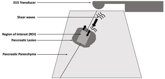 Elastography is a non-invasive imaging technology that has been widely studied in the evaluation of various organs including the liver, thyroid, and breast [1,2,3,4]. It evaluates the mechanical properties of tissues, focusing on assessing their stiffness [5]. Evaluation of tissue stiffness is essential in diagnosing and monitoring conditions such as fibrosis, given its impact on organ function [6]. For instance, elastography is often the preferred modality of assessment in evaluating metabolic dysfunction-associated steatotic liver disease (MASLD) as it provides valuable data on the degree of liver fibrosis. Elastography modalities include two main categories: strain elastography (SE) and shear wave elastography (SWE). Each of these methods provides distinct types of information about tissue stiffness. Strain elastography operates by applying external compression pressure to the tissue. It provides qualitative data, which can be visualized as color-coded images that represent levels of tissue stiffness [7]. While strain elastography can provide useful data, it is limited by its reliance on the operator’s skill and the external pressure applied to the tissue being studied [8]. A study by Dong et al. prospectively evaluated the inter-observer reproducibility of strain elastography between two operators when used in the evaluation of 124 breast lesions. The authors showed moderate inter-observer reproducibility when measuring the tissue elasticity value, suggesting that different operators might obtain varying results when performing strain elastography. In contrast, in SWE, the endoscopic ultrasound probe generates acoustic radiation force (“push pulse”), which produces shear waves that propagate through the tissue (Figure 1) [9,10,11]. The velocity of the propagated shear waves through the tissues is measured to provide a quantitative assessment of tissue stiffness. Furthermore, prior literature showed that SWE tends to be more reproducible compared to compression elastography, a type of strain elastography [12]. Thus, SWE is generally more reproducible and less operator-dependent compared to strain elastography [13].