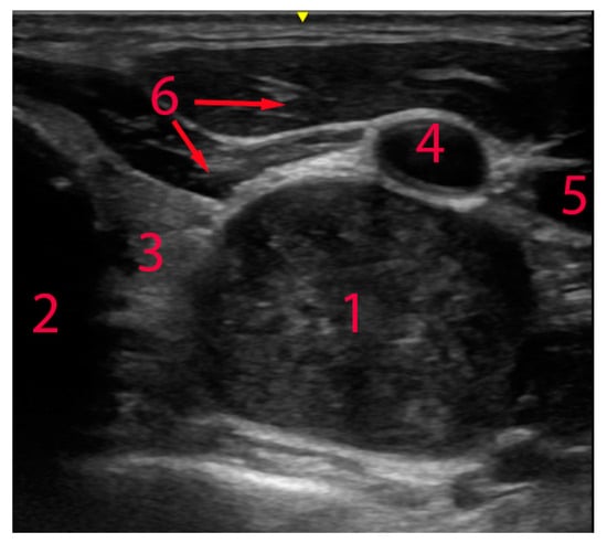 USG of the neck region at the level of the thyroid gland. 1—tumour, 2—trachea, 3—thyroid, 4—carotid artery, 5—jugular vein, 6—pretracheal muscles.