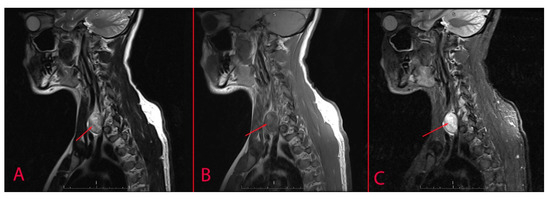 Soft tissue MRI (arrow indicates the tumour). (A)—T2, (B)—T1, (C)—T2 TIRM.