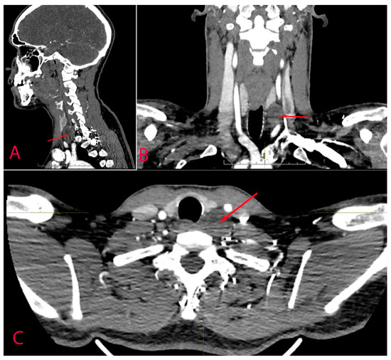 Contrast-enhanced CT scan of the neck at the level of the thyroid gland (arrow indicates the tumour). (A)—sagittal plane, (B)—frontal plane, (C)—axial plane.