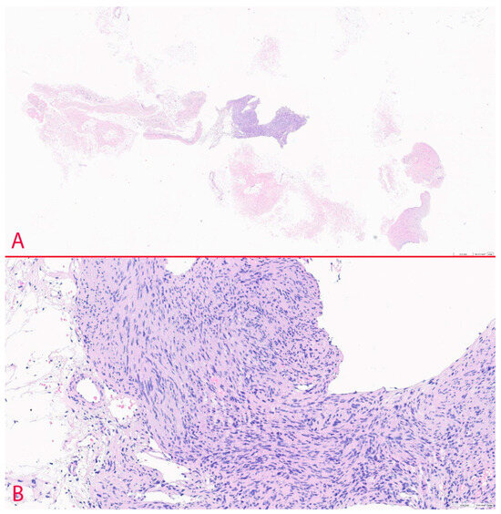 Histology of the specimens. (A)—CNB specimens (×5; H&E staining), (B)—CNB histology (×20 H&E staining).