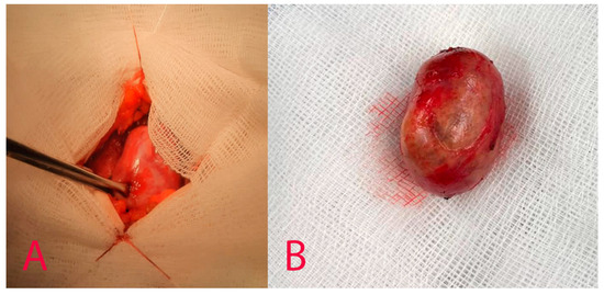 Macroscopic tumour appearance. (A)—intraoperative image of the tumour, (B)—postoperative specimen.