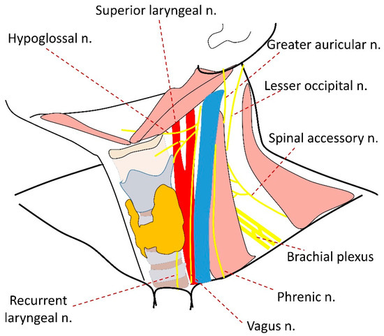 In up to 90% of cases, schwannomas are usually solitary and sporadic; however, they can be associated with type 2 neurofibromatosis or other genetic conditions [20]. Schwannomas of the cervical region stem from the vagus nerve in approximately 11–20% of cases. They can also originate from the sympathetic chain, which comprises 11–34% of cases, or the cervical plexus and the brachial plexus, which account for 3–50% and 17% of cases, respectively. In rare instances, schwannomas may result from the hypoglossal nerve (3–6%). Moreover, in some cases they can originate from the greater auricular nerve (5.6%), the hypoglossal nerve (3–5.55%), or even the recurrent laryngeal nerve (3%). The latter can lead to a misdiagnosis, as these tumours can be closely adjacent to the thyroid gland. In up to 17% of cases the exact origin of the nerve cannot be determined [5,6]. Figure 6 demonstrates the nerves, possible origins of schwannoma, and other neoplasms, which are located in close proximity to the thyroid. Tumours arising from some of these nerves can only be misidentified when they are large, with one of the tumour poles situated close to the thyroid gland. Schwannomas must be differentiated from paragangliomas and other nerve-associated tumours, such as neurofibromas, granular cell myoblastomas, neurogenic sarcomas, and melanomas [21].