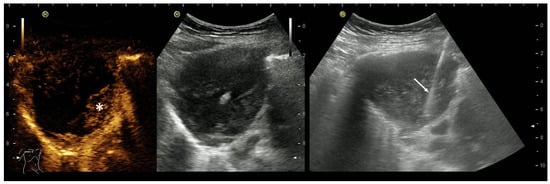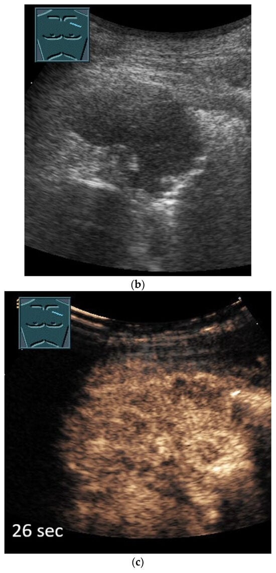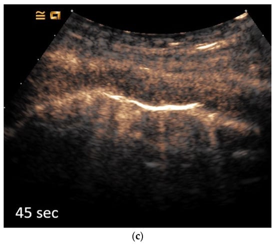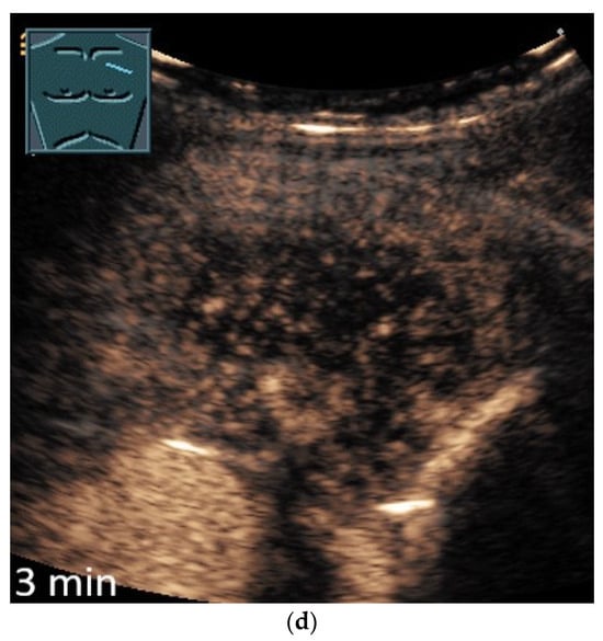 - Sidhu, P.S.; Cantisani, V.; Dietrich, C.F.; Gilja, O.H.; Saftoiu, A.; Bartels, E.; Bertolotto, M.; Calliada, F.; Clevert, D.A.; Cosgrove, D.; et al. The EFSUMB Guidelines and Recommendations for the Clinical Practice of Contrast-Enhanced Ultrasound (CEUS) in Non-Hepatic Applications: Update 2017 (Short Version). Ultraschall Med. 2018, 39, 154–180. [Google Scholar] [CrossRef]