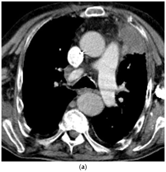 The prognosis is poor. In a study of 45 PPS within a period of 21 years, the median survival time and 5-year survival rates of resected and unresected PPS were 39.6 months and 28.7% and 4.9 months and 7.8%, respectively []. The clinical symptoms and imaging were similar to those of non-small-cell lung carcinomas (NSCLC). Locoregional invasion and distant metastases were common []. Typical symptoms are dyspnea, cough, chest, shoulder or back pain [,,]. The imaging methods of choice for examining the lesions are contrast-enhanced computed tomography (CECT), position emission tomography-CT (PET-CT) and magnet resonance imaging (MRI). The focal findings are usually extended in the images []. In a review of case series of primary pulmonary synovial sarcomas, these appeared on CT as solitary, large, well-circumscribed masses that were heterogeneously enhanced in contrast. The tumors were mostly larger than 7 cm. Calcifications were described [].