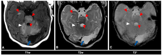 MR imaging of an 11-day-old female patient with neurocutaneous melanosis (NCM) using an MRI-compatible incubator. (A–C) Imaging findings of leptomeningeal (white arrowhead) and intraparenchymal melanosis (red arrowhead) demonstrate a high T1 signal, especially in the pons, cerebellum, and amygdala. These findings are not sufficiently detectable in T2-weighted (B) or T2 star (C) sequences (white arrowhead), at most a slight signal reduction in T2-weighted sequences. The patient also has an infratentorial arachnoid cyst (blue arrow). Spinal MRI showed no abnormalities (not shown). T1w = T1-weighted; T2w = T2-weighted; T2* = T2 star.