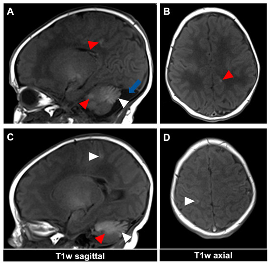 MR imaging of an 11-day-old female patient with neurocutaneous melanosis (NCM) using an MRI-compatible incubator. (A–D) Imaging findings of leptomeningeal (white arrowhead) and intraparenchymal melanosis (red arrowhead) demonstrate a high T1 signal in sagittal and corresponding axial planes. The image examples illustrate that acquiring two different planes of T1-weighted sequences is advantageous, as it is sometimes difficult to distinguish between leptomeningeal and intraparenchymal manifestations. The patient also has an infratentorial arachnoid cyst ((A), blue arrow). T1w = T1-weighted.