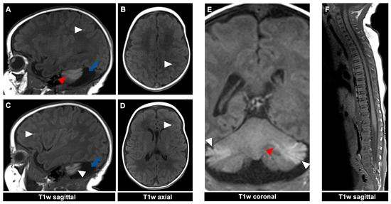 MR imaging of a 23-day-old female patient with neurocutaneous melanosis (NCM) using an MRI-compatible incubator. (A–E) Intraparenchymal (red arrowhead) and leptomeningeal (white arrowhead) melanosis imaging findings demonstrate a high T1 signal. The acquired sagittal and corresponding axial image examples (A–D) illustrate that acquiring two different planes of T1-weighted sequences is advantageous, as it is sometimes difficult to distinguish between leptomeningeal and intraparenchymal manifestations. The patient also has an infratentorial arachnoid cyst ((A,C) blue arrow). (F) Spinal MRI showed no abnormalities. T1w = T1-weighted.