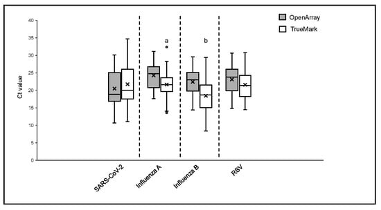 Ct values comparison between OpenArray® and TrueMark™ Select Panel detected for the detection of SARS-CoV-2, Flu A, Flu B, and RSV. Alphabets represent statistically significant differences between the two PCR tests (p < 0.05) in a t-test analysis.