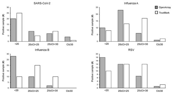 Distribution of Ct values for the positive cohort on OpenArray® and TrueMarkTM-based multiplex PCR laboratory-developed tests for the detection of SARS-CoV-2, Influenza A, Influenza B, and RSV.