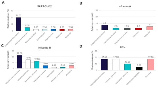 Relative prevalence of coinfecting organisms identified using the OpenArray® PCR platform among specimens that tested positive for (A) SARS-CoV-2, (B) Influenza A, (C) Influenza B, or (D) RSV.