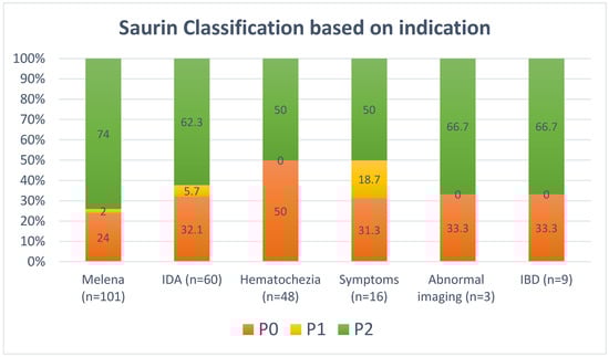 The majority of patients had definite significant pathological findings (Saurin class P2) on SBCE (130 patients, 61.9%), while 13 patients (6.2%) had findings of uncertain significance (Saurin class P1). The remaining patients had non-significant findings (Saurin class P0). The stratification of Saurin classification based on the indication for SBCE is shown in Figure 1. On multivariate regression analysis, melena at baseline was the only baseline factor significantly associated with increased odds of identifying significant pathology (Saurin class P2) on SBCE (OR 2.10, 1.03–4.30) (Table 5).