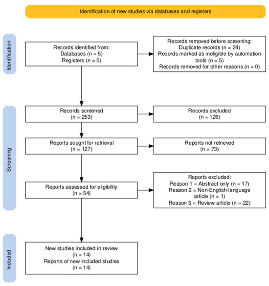 Figure 1 displays a flow diagram illustrating the selection procedure for eligible studies. A total of 253 studies were found in the initial search across the three databases. Before screening, we eliminate 29 duplicate studies. We searched five databases, and of the 54 articles, 40 were excluded due to not meeting the eligibility criteria. The studies we discovered examined individuals with an average age ranging from 47 to 62 years. We found several publications that were unsuitable due to their use of a language other than English (n = 1), articles that only included abstracts (n = 17), and articles that were classified as reviews (n = 22). The fourteen included publications [30,31,32,33,34,35,36,37,38,39,40,42,43,52] consist of four from South Korea and China, two from Germany and the USA, and one from the UK and France, respectively. A total of 11 papers employed conventional treatment, with 5 being multi-center studies, while the remaining 9 utilized single-center research. The sample sizes of these studies varied from 22 to 652 people. A grand number of 2.950 samples took part in this study. The hazard ratios (HRs) and 95% CIs were directly obtained from the source articles in the investigations mentioned above. Table 1 presents the attributes and qualities of the studies that have been enumerated.