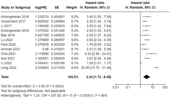 We examined the analysis of OS in Figure 2 in glioblastoma. All twelve OS studies were considered, involving 1.639 patients from Germany, the USA, China, South Korea, the UK, and France. The random effects model was used to calculate the pooled HR for OS. The HR for OS was 3.34 (95% confidence interval [CI], 1.72–6.45). The analysis revealed heterogeneity in the OS with an I2 value of 96%.