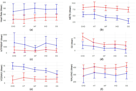 Figure 1. The changes in various CPET and other cardiac indicators means and CIs before (blue line) and after (red line) ablation: (a) Heart rate; (b) METs; (c) Nt-proBNP; (d) O2 pulse; (e) Vo2 max; (f) 6-min walking test.
