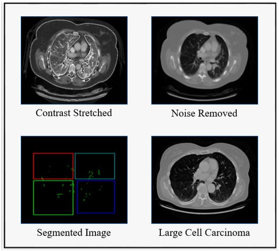Here, the sample image of the suggested methodology is shown in Figure 4. In Figure 4A, the original CT sample images are displayed. As can be seen in Figure 4B, the contrast-stretch applied to the input images is preprocessed to remove noise using RWICWM. Next, in the picture of Figure 4C, we see the edge enhancement image. After, in Figure 4D, we see segmentation. Finally, Figure 4E the classified output is large-cell cancer, squamous cell cancer [51], and normal (without carcinoma).