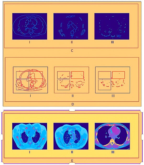 Sample images in the proposed model. (A,B) The top and bottom images show the original CT sample images and the contrast-stretched images. (C,D) The top and bottom images show the edge enhancement image and segmentation. (E) The images show the classified output (large-cell cancer, squamous cell cancer, and normal).