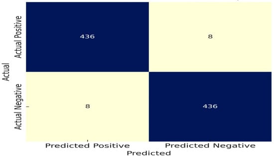 The algorithm’s accuracy for risk evaluation was 96.8%. With 14 false positives and 14 false negatives, the confusion matrix displays 430 true positive high-risk evaluations and 430 true negative low-risk assessments. These findings highlight the algorithm’s potential to support clinical decisions in lung cancer detection and management by confirming its dependability in differentiating between high and low cancer risks across all 888 CT scans.