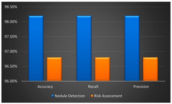 The model performs exceptionally well in risk assessment and nodule detection, exhibiting high accuracy, recall, and precision values. With excellent accuracy (98.2%), recall (98.2%), and precision (98.2%) in nodule detection, there is a perfect balance, showing efficient nodule identification and low rates of false positives and false negatives. Comparably, the risk assessment likewise attains good recall, precision, and accuracy (96.8%, 96.8%, and 96.8%), indicating a dependable and error-free classification of high-risk patients.