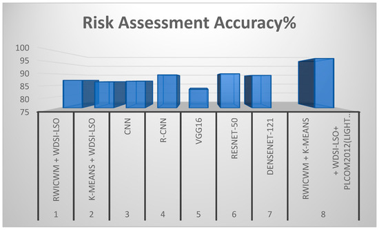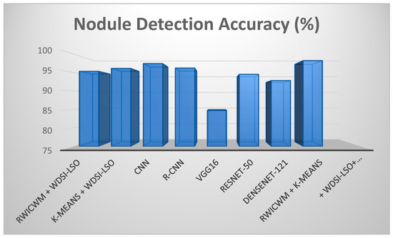 The outcomes of further tests assessing different preprocessing techniques and architectures for nodule recognition and risk assessment are shown in Table 7. Experiment 1 achieved the highest nodule detection accuracy of 98.2% and a considerable risk assessment accuracy of 96.8% by combining RWICWM, K-means, WDSI-LSO, and PLCOm2012. With UNet and WDSI-LSO, Experiment 2 produced an accuracy of 95.9% for nodule detection and 87.9% for risk assessment. In the third experiment, the combination of InceptionV3 and RWICWM yielded 96.8% detection accuracy and 88.4% assessment accuracy. The results of Experiment 4, which combined 3D-CNN with K-means and WDSI-LSO, showed an accuracy of 89.2% for risk assessment and 97.1% for nodule detection. Lastly, Experiment 5 obtained a nodule detection accuracy of 98.0% and a risk assessment accuracy of 95.7% by using a hybrid CNN-RNN model with RWICWM and PLCOm2012. These findings emphasize the differences in performance between approaches and the benefits of fusing sophisticated preprocessing methods with cutting-edge deep learning architectures.