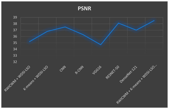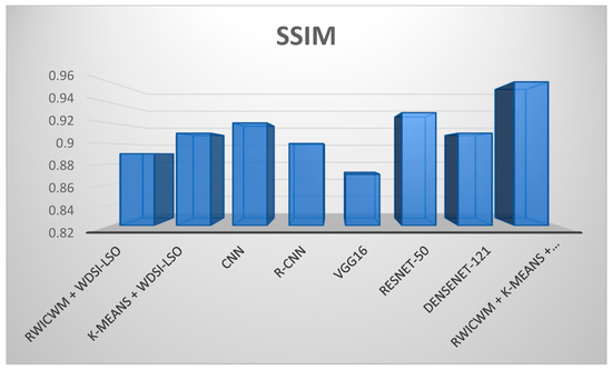 The model retains good quality in terms of image reconstruction or processing, even if it is lightweight. This is demonstrated in Figure 8 and Figure 10 by its higher PSNR and SSIM scores as compared to other models. So, when these factors are combined, the “RWICWM + K-means + WDSI-LSO + PLCOm2012 (Lightweight)” DNN model seems to balance performance and efficiency, making it a good option for situations where speed is important or computational resources are scarce, without compromising image quality.