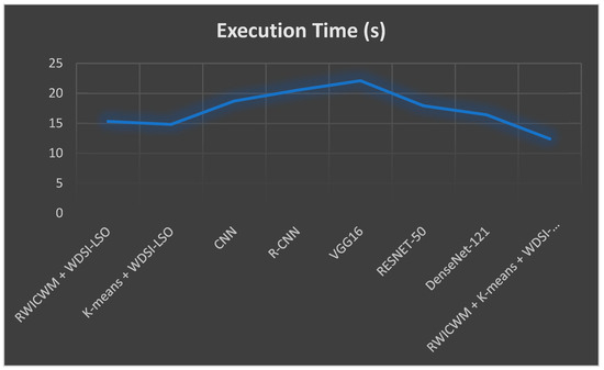 When compared to other models, a lightweight model usually involves faster execution. The suggested model (RWICWM + K-means + WDSI-LSO + PLCOm2012) had the shortest execution time of all the models given, at 12.4 s, which is depicted in Figure 9.