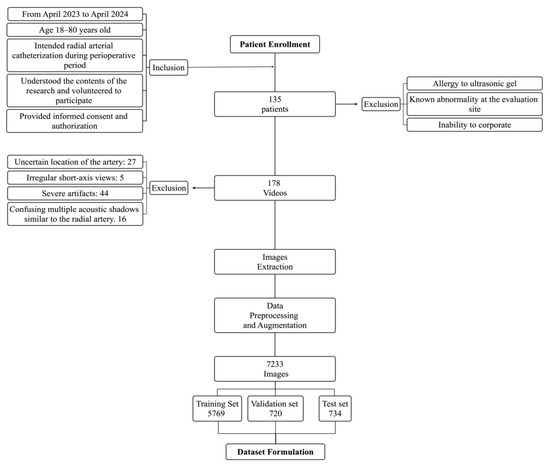 Approved by the Ethics Review Committee of the Chinese Academy of Medical Sciences & Peking Union Medical College Hospital (I-23PJ662), patients were enrolled from May 2023 to Jan 2024 according to the inclusion and exclusion criteria depicted in Figure 1. The patient characteristics were withheld during the entire implementation process of the current study. From the location next to the styloid process of the radius to the confluence to the brachial artery, the radial arteries in both forearms of each patient were continuously scanned and acquired using B-mode ultrasound. The original videos were captured at a resolution of 1200 × 868 pixels for each frame. The frame rates of the videos varied, with approximately 120 videos recorded at 28 frames per second (fps), 30 videos at 25 fps, over 10 videos at 10 fps, and 7 videos at 49 fps. The majority of the videos contained 400 to 600 frames. To fit real-world scenarios and enrich data diversity, videos were acquired using three different ultrasound settings: the SonoSite X-Porter (FUJIFILM Sonosite, Inc., Bothell, WA, USA), the Mindray UMT-150 (Mindray Ltd., Shenzhen, China), and the Wisonic Navi S (Wisonic Medical Technology Co., Ltd., Shenzhen, China). Each ultrasound scanner was equipped with linear array probes with frequencies of 4 to 16 MHz.
