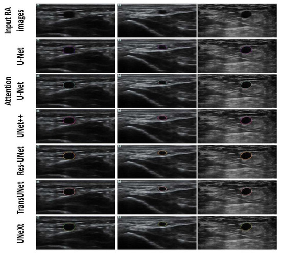 Representative input images (Row 1) and corresponding RAT results performed by U-Net (Row 2), Attention U-Net (Row 3), U-Net++ (Row 4), Res-UNet (Row 5), TransUNet (Row 6), and UNeXt (Row 7). Red contours were labeled by the expert. Contours in colors other than red were the segmentation of the corresponding deep learning architecture.