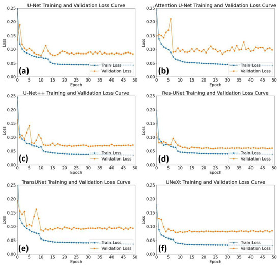 The loss functions of training and validating processes for U-Net (a), Attention U-Net (b), U-Net++ (c), Res-UNet (d), TransUNet (e), and UNeXt (f).
