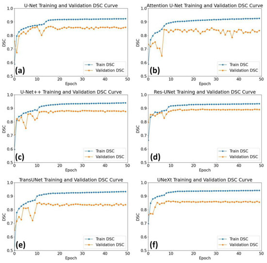 The DSC of training and validating processes for U-Net (a), Attention U-Net (b), U-Net++ (c), Res-UNet (d), TransUNet (e), and UNeXt (f).