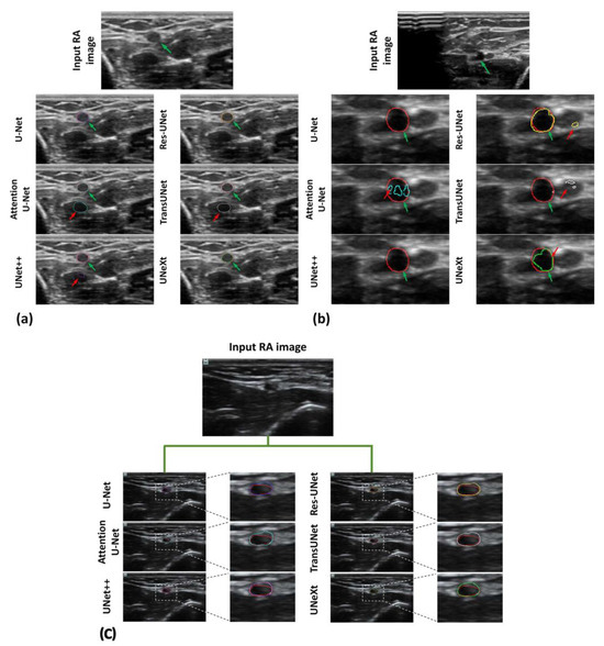 Hence, this pilot study has some limitations and leaves a few questions unanswered. Challenges of the automatic segmentation during RAT exist in certain types of cases, as illustrated in Figure 7. There were challenges in distinguishing between hypoechoic muscle encapsulated with fascia and radial artery presents challenges when applying architectures such as Attention U-Net, TransUNet, and UNet++, as shown in Figure 7a. When multiple vessels or vascular branches were present concomitantly (Figure 7b), the U-Net, U-Net++, and TransUNet models failed to identify the vessel location, Attention U-Net and UNeXt exhibited under-segmentation. ResUNet could detect the vessel, but there was another small over-segmentation region (red arrow in Figure 7b). Despite advancements of the U-Net series in identifying ambiguous boundaries, the enhanced capability to accurately delineate tiny vessels confounded by hyperechoic tissues required further exploration, as shown in Figure 7c. In future work, these challenging cases may be addressed as follows. For the challenge in Figure 7a, multi-modality ultrasound image fusion may be applied, i.e., incorporating multi-modality ultrasound data, such as ultrasound elastography [34] or color Doppler imaging, to complement B-mode ultrasound. As the hypoechoic tissue may have different elasticity or blood flow properties from the radial artery, the differentiation between hypoechoic tissues and the radial artery can be enhanced with elastography or color Doppler images. For the challenge in Figure 7b, the presence of multiple vessels or vascular branches, a rare case in the current model training, results in poor generalization when segmenting such instances. Increasing the number of such cases in the training set may improve the model’s performance in future work. For the challenge in Figure 7c, super-resolution reconstruction techniques may be employed. For instance, generative adversarial networks or super-resolution networks may be utilized to improve the resolution of ultrasound images [35]. This would improve image resolution, making the boundaries of small radial arteries more distinct and thereby enhancing segmentation accuracy.