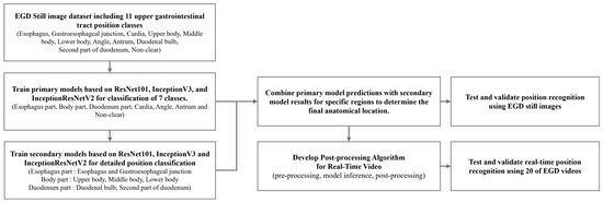 In this study, we propose the development of a fine-grained position prediction model for anatomical locations in the gastrointestinal tract using only still images. The flowchart of this study is shown in Figure 1. The model was configured to predict 11 anatomical locations: esophagus (ES), gastroesophageal junction (GE), cardia (CR), upper body (UB), middle body (MB), lower body (LB), angle (AG), antrum (AT), duodenal bulb (BB), second part of the duodenum (SD), and non-clear parts (NO). A dataset of still gastric images was then constructed. To achieve more detailed location recognition, we combined images of similar regions into single-part classes to train the primary model. Subsequently, we developed a secondary model to classify the combined classes into individual classes. By applying the results from both models, we obtained final predictions for the 11 anatomical locations. Using a test dataset composed of single images, we verified the prediction performance of each trained model and compared the final prediction results with the actual locations. This allowed us to confirm that the camera’s position during an examination can be recognized using only still images from gastroscopy.
