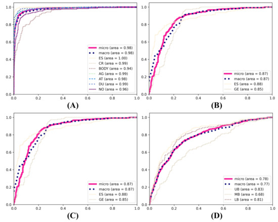 ROC curves of the primary and secondary deep learning models. (A) Esophagus part, cardia, gastric bodies part, angle, antrum, duodenum part, and non-clear. (B) Esophagus and gastroesophageal junction. (C) Upper body, middle body, and lower body. (D) Duodenal bulb and duodenum second portion.