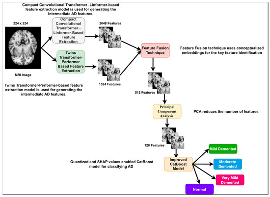 The authors proposed a ViTs-based feature-extraction technique, a contextualized feature-fusion technique, and a fine-tuned classification technique for detecting AD using MRI images. CCT and TT can extract meaningful features by focusing on crucial AD patterns. The CatBoost model can classify the features with high precision compared to the existing gradient-boosting techniques. However, higher computational resources may limit their performance in the resource-constrained environment. By modifying the architecture of CCT and TT, the authors enhanced the feature-extraction process in order to understand intricate AD patterns. The CatBoost model’s classification performance is enhanced by streamlining the hyperparameter tuning process. The authors minimized the computational overhead using the quantization technique. In addition, they improved the model’s interpretability using the SHAP values.