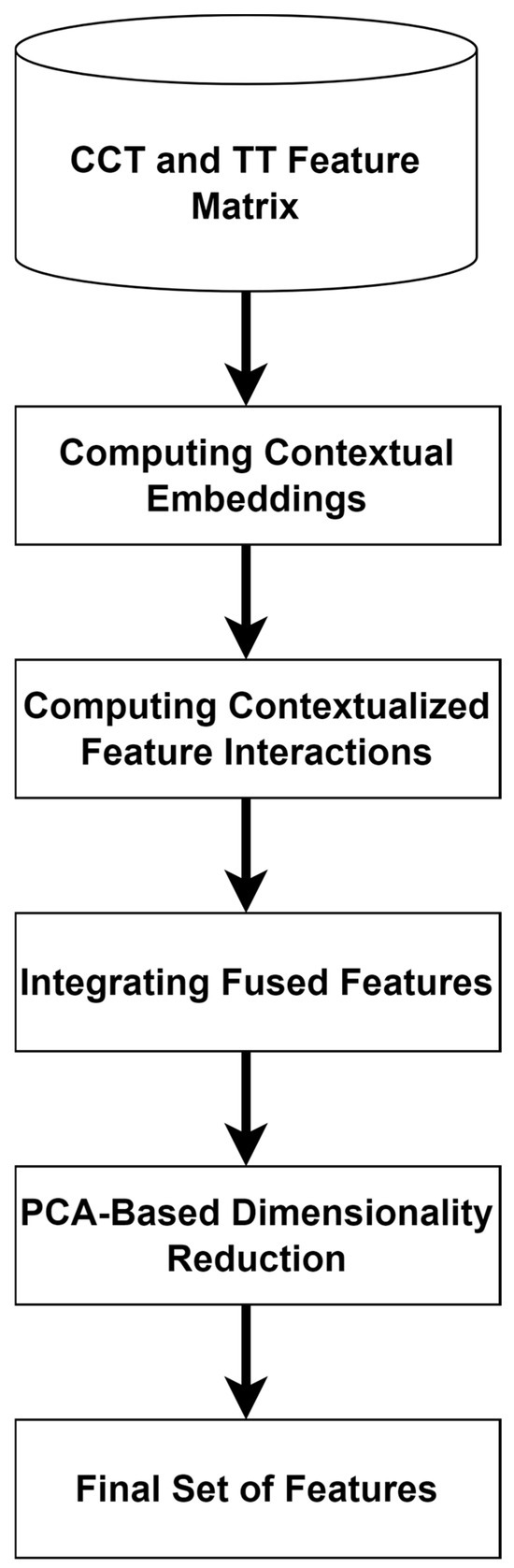 To generate a robust and valuable feature set, feature fusion leverages the benefits of multiple models or data representations. The proposed feature-fusion technique improves AD diagnosis by utilizing CCT and TT features. The authors apply linear transformations or embedding layers to project the CCT and TT features into a common-dimensional space. They employ the attention-based fusion technique for feature fusion. The attention mechanism enables the proposed feature-fusion model to weigh the significance of features dynamically. Cross-attention is used to align and merge the features. Dot-product attention is employed to calculate attention scores. During the process, the query vectors of CCT are multiplied by key vectors of TT. To normalize the attention scores, a Softmax function is used. It ensures that the attention weights sum up to 1, enabling the proposed model to focus on the crucial AD features.