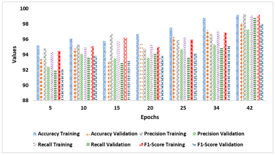 Figure 5 shows the AD classification model’s performance improving over training epochs. It represents a noticeable improvement with increasing epochs. A consistent pattern of improved accuracy, precision, recall, and F1-score in training and validation phases is observed as the number of epochs increases from 5 to 34. The model achieves a significant point with a validation accuracy of over 95% and sustained progress in additional indicators by 20 epochs. The model’s recall and F1-score are stable at 94%, indicating effective learning without overfitting. The model reaches its optimum performance at the 42nd epoch, with training and validation accuracies of 99.2% and 98.2%, respectively. There is no sign of further considerable progress after the 42nd epoch, indicating that the model has reached saturation. The minimal variation between training and validation outcomes indicates effective generalization with low overfitting. These findings suggest that the model gained knowledge from the training data and generalized substantially to the validation data, making it a promising AD classification model. The hybrid ViTs and quantized CatBoost classifier handled MRI images effectively, maintaining high recall and F1-score.