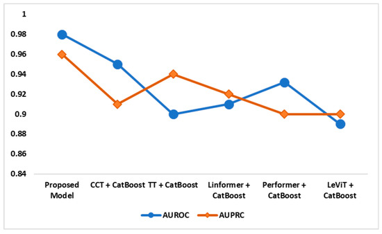 Figure 10 illustrates the AD classification models’ AUROC and AUPRC performances. The suggested model achieved remarkable AUROC and AUPRC scores of 0.98 and 0.96, respectively. The recommended feature fusion and enhanced CatBoost models identified the crucial AD patterns with high accuracy. Compared to the existing models, the proposed model successfully differentiates AD classes and maintains accuracy and recall.