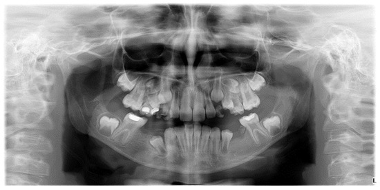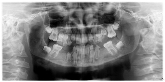 Orthopantomogram of a patient with mixed dentition, clinical diagnosis of MIH, and radiographically certified hypodontia.