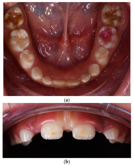 - Moulis, E.; Barthélemi, S.; Delsol, L. Orthodontic treatment of children with class II division 1 with severe MIH involving first permanent molars extractions: A case report. Int. Orthod. 2020, 18, 885–894. [Google Scholar] [CrossRef]