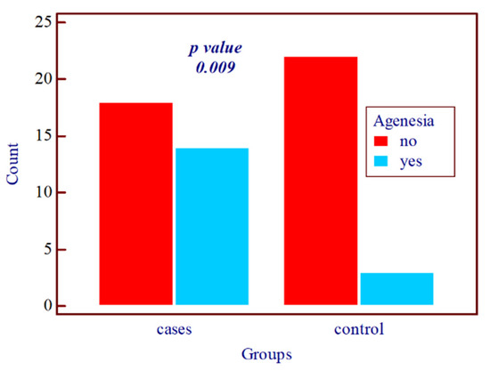 Graphic illustration of agenesis in the study group compared to the control group.